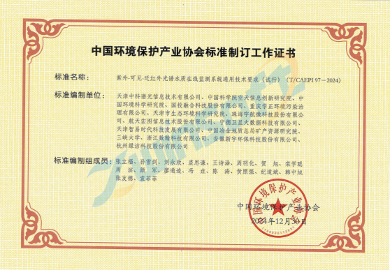 近日,由智易时代参与编制的《紫外-可见-近红外光谱水质在线监测系统通用技术要求(试行)》(标准编号:T/CAEPI 97-2024,T/CWEA 31-2024)团体标准证书正式下发。作为环保监测领域的企业,智易时代凭借十余年的技术积淀与实践经验,深度参与该标准的制定工作,为推动水质监测技术标准化、提升行业规范水平注入核心动能。